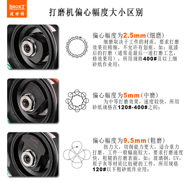 --粗磨偏心度幅度為9.5mm,扭力大,切削能力更大,適合重力打磨。工件一般幅面較大,要求打磨速度快,粗糙的打磨表面,如:玻璃鋼,UV,原子灰等材質(zhì)比較硬的工件,所用砂紙規(guī)格120#以下;