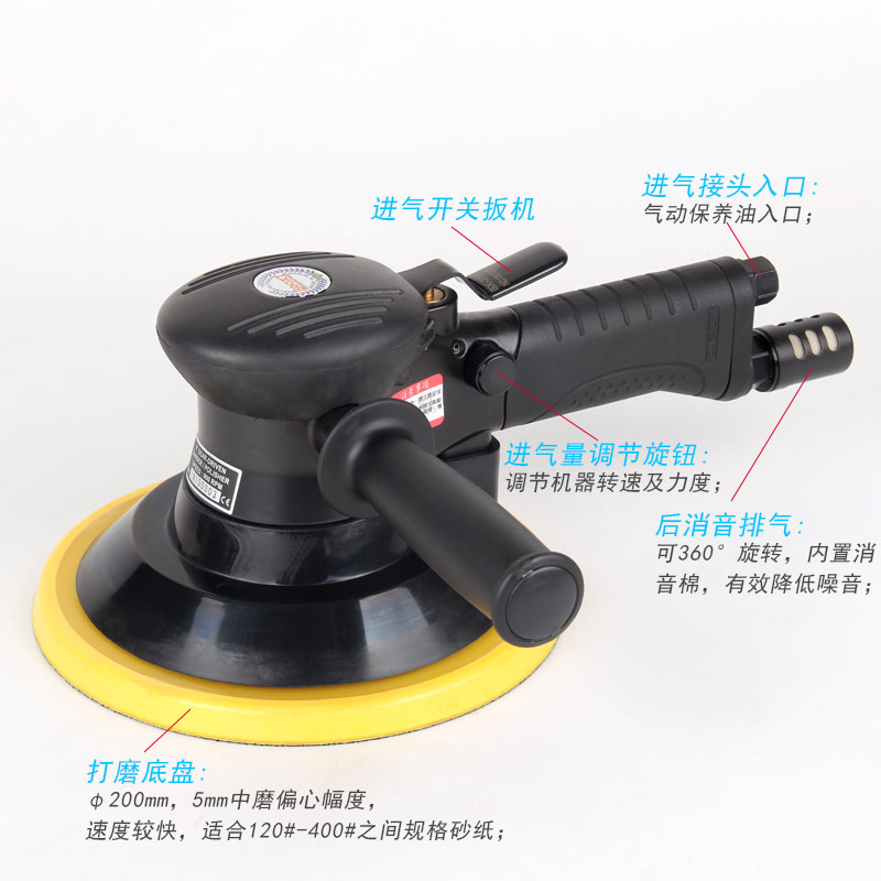 • 產(chǎn)品參數(shù): 底盤尺寸:200mm 空載轉(zhuǎn)速:900rpm 偏擺直徑:5mm 重 量:2.3kg 耗 氣 量:3.5cfm/min
