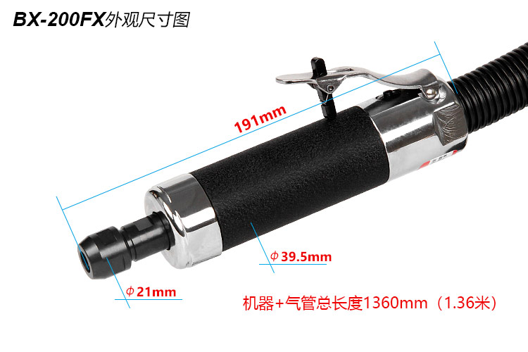 • 產(chǎn)品參數(shù): 夾頭尺寸:標(biāo)配6mm;選配m3,m8 空載轉(zhuǎn)速:22000rpm; 工具長(zhǎng)度:191mm; 工具重量:1.10kg; 馬達(dá)功率:0.6HP; 后排氣; 耗氣量:0.45m3/min; 使用工作氣壓:0.65Mpa; 推薦使用內(nèi)徑8mm氣管; 平時(shí)使用應(yīng)多加氣動(dòng)油保養(yǎng). 【工業(yè)型/歐式/帶消音】